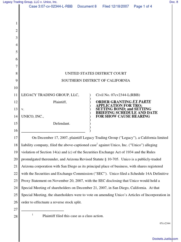 Order Granting Ex Parte Application For Tro Setting Bond And Setting Briefing Schedule And Date For Show Cause Hearing Ex Parte Injunction